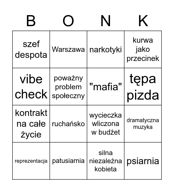 This bingo card has 17 words: silna niezależna kobieta, reprezentacja, narkotyki, szef despota, ruchańsko, kurwa jako przecinek, dramatyczna muzyka, "mafia", tępa pizda, poważny problem społeczny, patusiarnia, wycieczka wliczona w budżet, vibe check, Warszawa, kontrakt na całe życie, wszechwiedzący and psiarnia.