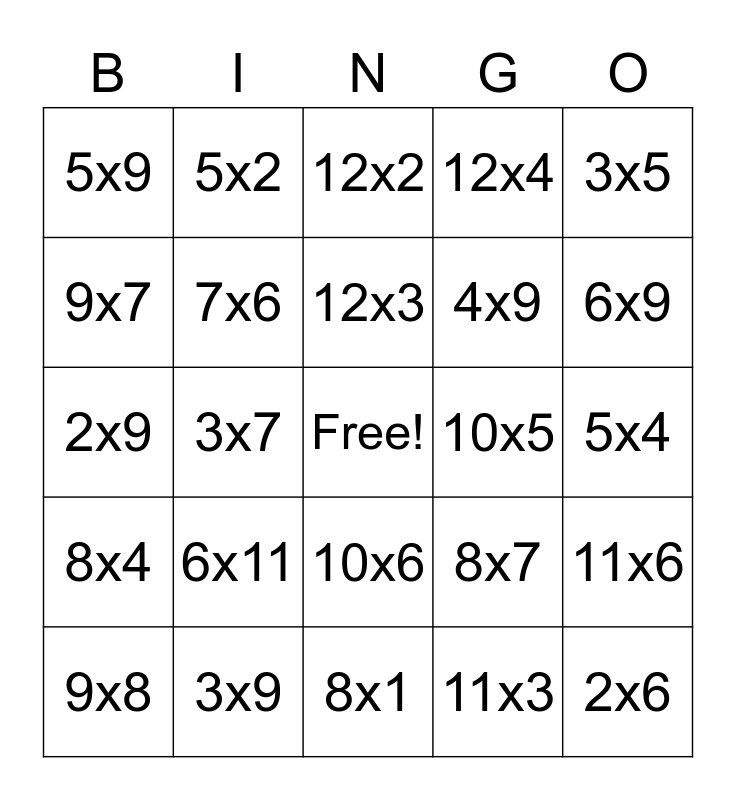 This bingo card has a free space and 29 words: 9x8, 8x3, 3x7, 3x5, 5x9, 12x2, 7x6, 6x11, 10x5, 3x9, 5x4, 2x6, 8x1, 11x3, 6x9, 10x3, 10x6, 8x4, 3x5, 2x9, 8x7, 12x4, 4x9, 9x7, 12x4, 5x2, 11x6, 12x3 and 9x9.