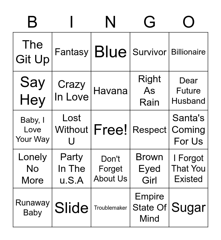 This bingo card has a free space and 24 words: Party In The u.S.A, Slide, Havana, Runaway Baby, Billionaire, The Git Up, Say Hey, Fantasy, Respect, Don't Forget About Us, Right As Rain, Baby, I Love Your Way, Brown Eyed Girl, I Forgot That You Existed, Crazy In Love, Empire State Of Mind, Santa's Coming For Us, Blue, Dear Future Husband, Lost Without U, Sugar, Lonely No More, Survivor and Troublemaker.