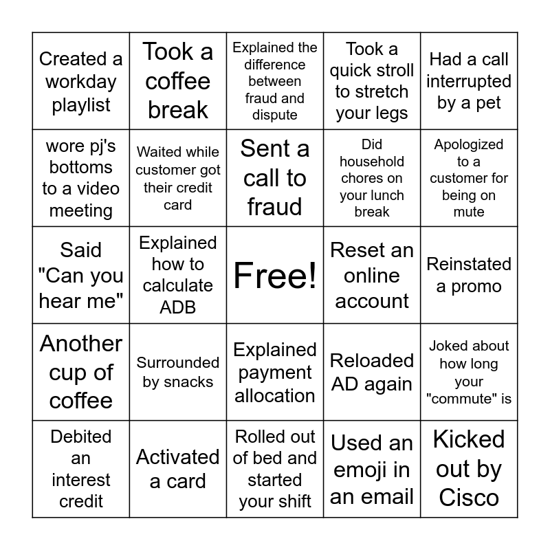 This bingo card has a free space and 24 words: Surrounded by snacks, Activated a card, Sent a call to fraud, Debited an interest credit, Had a call interrupted by a pet, Created a workday playlist, wore pj's bottoms to a video meeting, Took a coffee break, Reset an online account, Explained payment allocation, Did household chores on your lunch break, Said "Can you hear me", Reloaded AD again, Joked about how long your "commute" is, Waited while customer got their credit card, Used an emoji in an email, Reinstated a promo, Explained the difference between fraud and dispute, Apologized to a customer for being on mute, Explained how to calculate ADB, Kicked out by Cisco, Another cup of coffee, Took a quick stroll to stretch your legs and Rolled out of bed and started your shift.