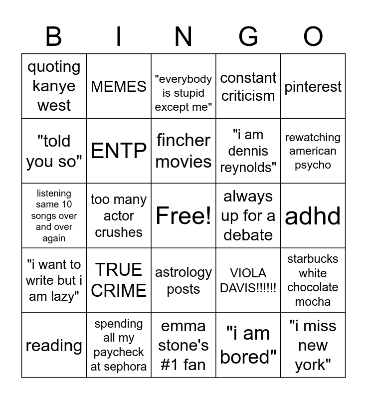 This bingo card has a free space and 24 words: TRUE CRIME, spending all my paycheck at sephora, fincher movies, reading, pinterest, quoting kanye west, "told you so", MEMES, always up for a debate, astrology posts, "i am dennis reynolds", listening same 10 songs over and over again, VIOLA DAVIS!!!!!!, starbucks white chocolate mocha, ENTP, "i am bored", adhd, "everybody is stupid except me", rewatching american psycho, too many actor crushes, "i miss new york", "i want to write but i am lazy", constant criticism and emma stone's #1 fan.