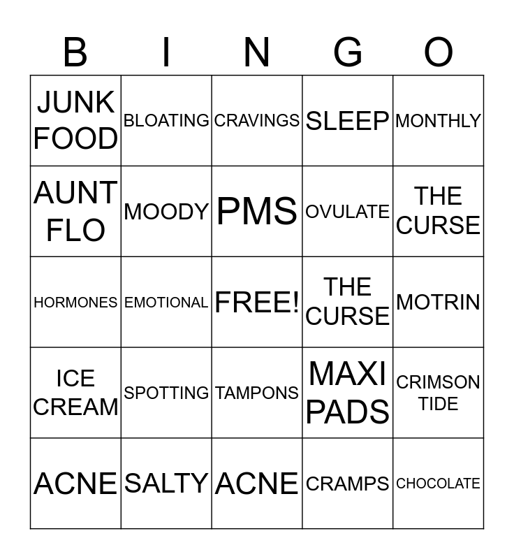 This bingo card has a free space and 24 words: SPOTTING, SALTY, PMS, ACNE, MONTHLY, JUNK FOOD, AUNT FLO, BLOATING, THE CURSE, TAMPONS, OVULATE, HORMONES, MAXI PADS, CRIMSON TIDE, MOODY, CRAMPS, MOTRIN, CRAVINGS, THE CURSE, EMOTIONAL, CHOCOLATE, ICE CREAM, SLEEP and ACNE.