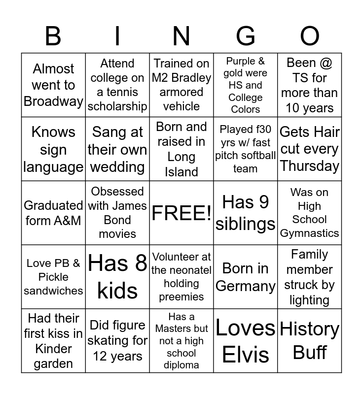 This bingo card has a free space and 24 words: Has 8 kids, Did figure skating for 12 years, Born and raised in Long Island, Had their first kiss in Kinder garden, Been @ TS for more than 10 years, Almost went to Broadway, Knows sign language, Attend college on a tennis scholarship, Has 9 siblings, Volunteer at the neonatel holding preemies, Played f30 yrs w/ fast pitch softball team, Graduated form A&M, Born in Germany, Family member struck by lighting, Sang at their own wedding, Loves Elvis, Was on High School Gymnastics, Trained on M2 Bradley armored vehicle, Gets Hair cut every Thursday, Obsessed with James Bond movies, History Buff, Love PB & Pickle sandwiches, Purple & gold were HS and College Colors and Has a Masters but not a high school diploma.