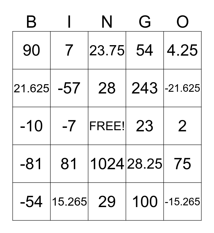This bingo card has a free space and 24 words: 81, 15.265, 28, -54, 4.25, 90, 21.625, 7, 23, 1024, 243, -10, 28.25, 75, -57, 100, 2, 23.75, -21.625, -7, -15.265, -81, 54 and 29.