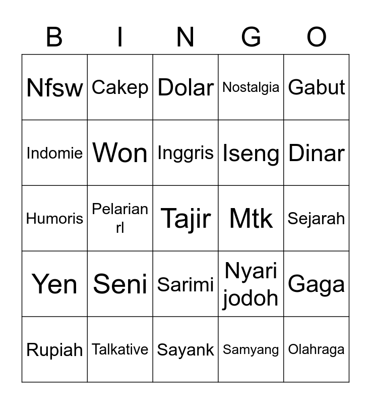 This bingo card has a free space and 24 words: Seni, Talkative, Inggris, Rupiah, Gabut, Nfsw, Indomie, Cakep, Mtk, Sarimi, Iseng, Humoris, Nyari jodoh, Gaga, Won, Samyang, Sejarah, Dolar, Dinar, Pelarian rl, Olahraga, Yen, Nostalgia and Sayank.