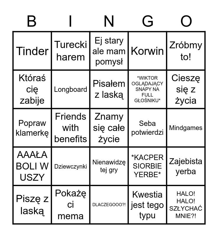This bingo card has 25 words: Dziewczynki, DLACZEGOOO?!, Pisałem z laską, Piszę z laską, Zróbmy to!, Tinder, Któraś cię zabije, Turecki harem, Seba potwierdzi, Nienawidzę tej gry, *WIKTOR OGLĄDAJĄCY SNAPY NA FULL GŁOŚNIKU*, Popraw klamerkę, *KACPER SIORBIE YERBE*, Zajebista yerba, Longboard, HALO! HALO! SZŁYCHAĆ MNIE?!, Mindgames, Ej stary ale mam pomysł, Cieszę się z życia, Friends with benefits, Znamy się całe życie, Pokażę ci mema, AAAŁA BOLI W USZY, Korwin and Kwestia jest tego typu.