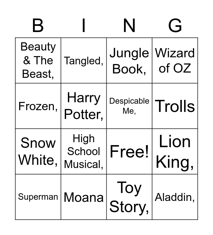 This bingo card has 19 words: Free!, Mary Poppins,, Jungle Book,, Aladdin,, Lion King,, Frozen,, Toy Story,, Beauty & The Beast,, Tangled,, Snow White,, High School Musical,, Harry Potter,, Despicable Me,, Moana, Superman, Star Wars, Wizard of OZ, Trolls and Sing.