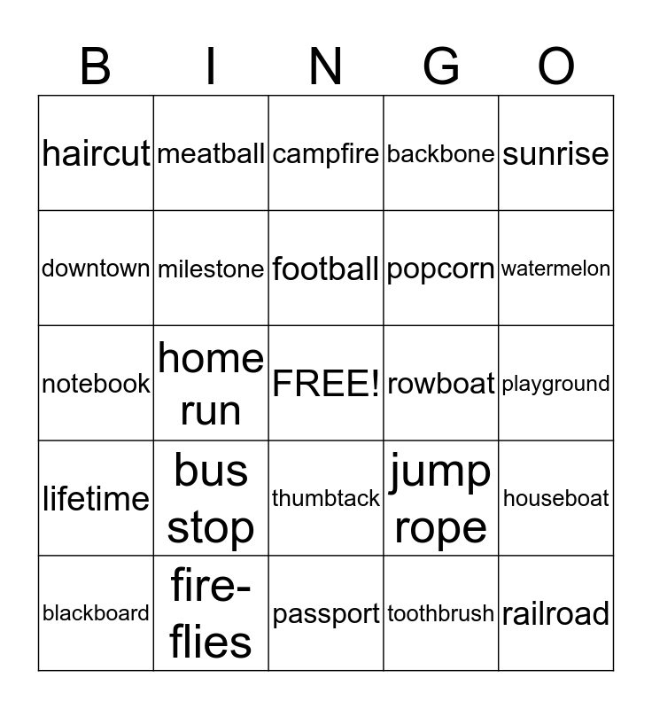 This bingo card has a free space and 24 words: bus stop, fire-flies, football, blackboard, sunrise, haircut, downtown, meatball, rowboat, thumbtack, popcorn, notebook, jump rope, houseboat, milestone, toothbrush, playground, campfire, watermelon, home run, railroad, lifetime, backbone and passport.