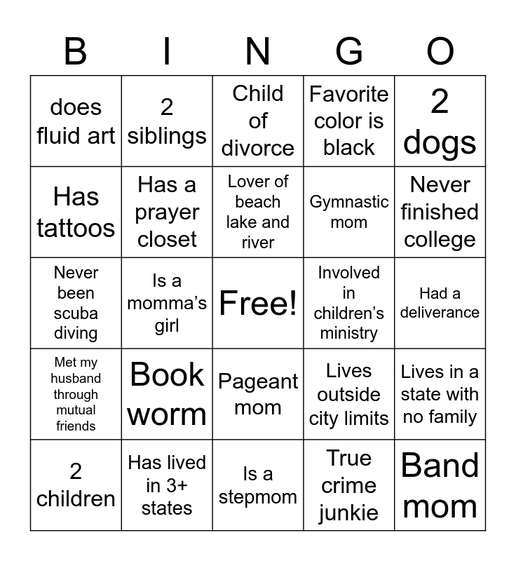 This bingo card has a free space and 24 words: 2 children, Book worm, Lover of beach lake and river, True crime junkie, 2 dogs, does fluid art, 2 siblings, Child of divorce, Involved in children’s ministry, Had a deliverance, Never been scuba diving, Has a prayer closet, Lives outside city limits, Lives in a state with no family, Has tattoos, Has lived in 3+ states, Is a stepmom, Favorite color is black, Never finished college, Met my husband through mutual friends, Is a momma’s girl, Pageant mom, Gymnastic mom and Band mom.