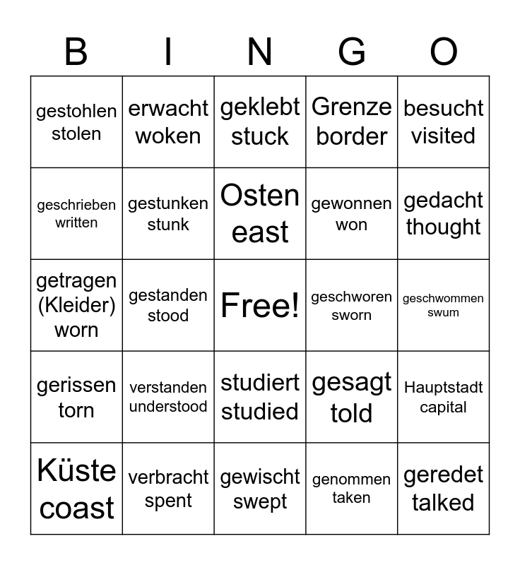 This bingo card has a free space and 30 words: verbracht spent, ausgebreitet spread, gestanden stood, geblieben stayed, gestohlen stolen, geklebt stuck, gestunken stunk, studiert studied, geschworen sworn, gewischt swept, geschwommen swum, geredet talked, genommen taken, gelehrt taught, gedacht thought, geworfen thrown, gesagt told, gerissen torn, verstanden understood, besucht visited, getragen (Kleider) worn, zurückgezogen withdrawn, erwacht woken, gewonnen won, geschrieben written, Grenze border, Hauptstadt capital, Küste coast, Osten east and enorm enormous.
