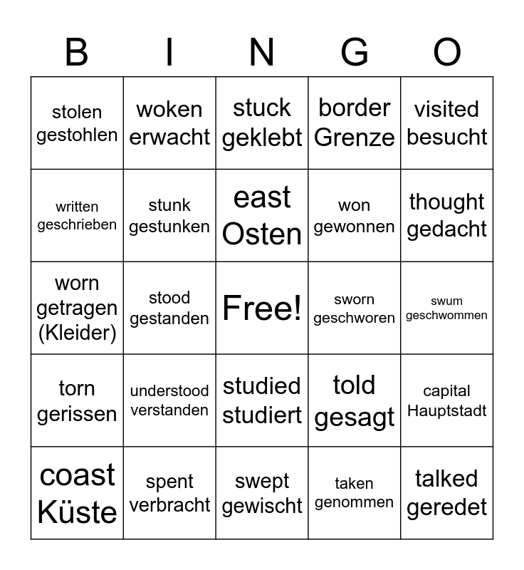 This bingo card has a free space and 30 words: spent verbracht, spread ausgebreitet, stood gestanden, stayed geblieben, stolen gestohlen, stuck geklebt, stunk gestunken, studied studiert, sworn geschworen, swept gewischt, swum geschwommen, talked geredet, taken genommen, taught gelehrt, thought gedacht, thrown geworfen, told gesagt, torn gerissen, understood verstanden, visited besucht, worn getragen (Kleider), withdrawn zurückgezogen, woken erwacht, won gewonnen, written geschrieben, border Grenze, capital Hauptstadt, coast Küste, east Osten and enormous enorm.