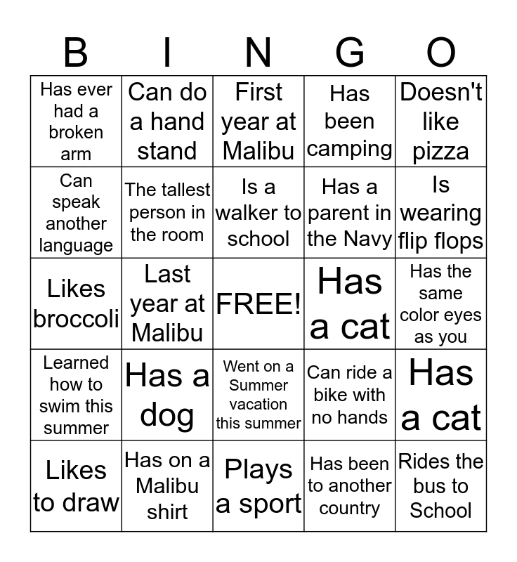 This bingo card has a free space and 24 words: Has a dog, Has on a Malibu shirt, Is a walker to school, Likes to draw, Doesn't like pizza, Has ever had a broken arm, Can speak another language, Can do a hand stand, Has a cat, Went on a Summer vacation this summer, Has a parent in the Navy, Likes broccoli, Can ride a bike with no hands, Has a cat, The tallest person in the room, Has been to another country, Has the same color eyes as you, First year at Malibu, Is wearing flip flops, Last year at Malibu, Rides the bus to School, Learned how to swim this summer, Has been camping and Plays a sport.