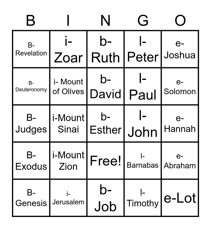 This bingo card has 26 words: Free!, B- Genesis, i- Mount of Olives, b- Leah, l-Peter, e-Joshua, B-Deuteronomy, i-Zoar, b-David, l-Timothy, e-Solomon, B-Judges, i-Jerusalem, b-Job, l-John, e-Lot, B-Revelation, i-Mount Zion, b- Ruth, l-Barnabas, e-Hannah, B-Exodus, i-Mount Sinai, b-Esther, l-Paul and e-Abraham.