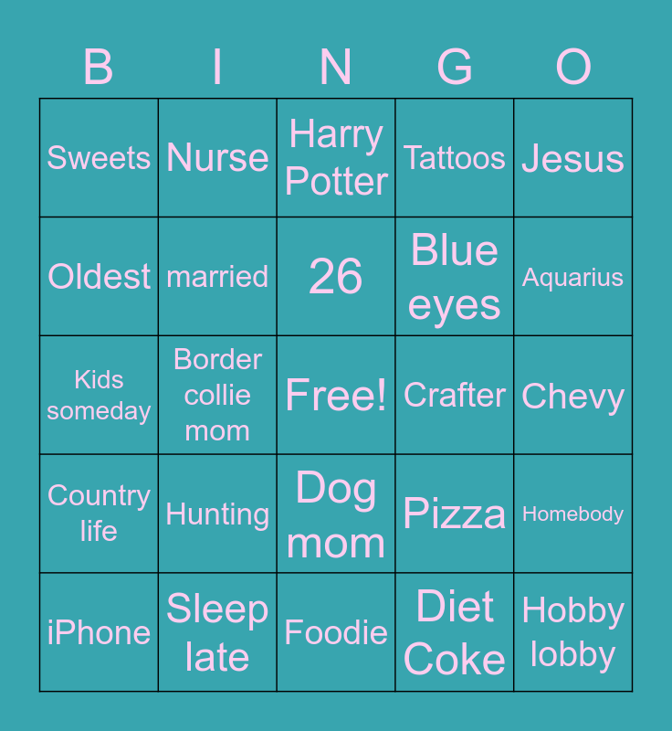 This bingo card has a free space and 24 words: Hunting, Sleep late, 26, iPhone, Jesus, Sweets, Oldest, Nurse, Crafter, Dog mom, Blue eyes, Kids someday, Pizza, Homebody, married, Diet Coke, Chevy, Harry Potter, Aquarius, Border collie mom, Hobby lobby, Country life, Tattoos and Foodie.