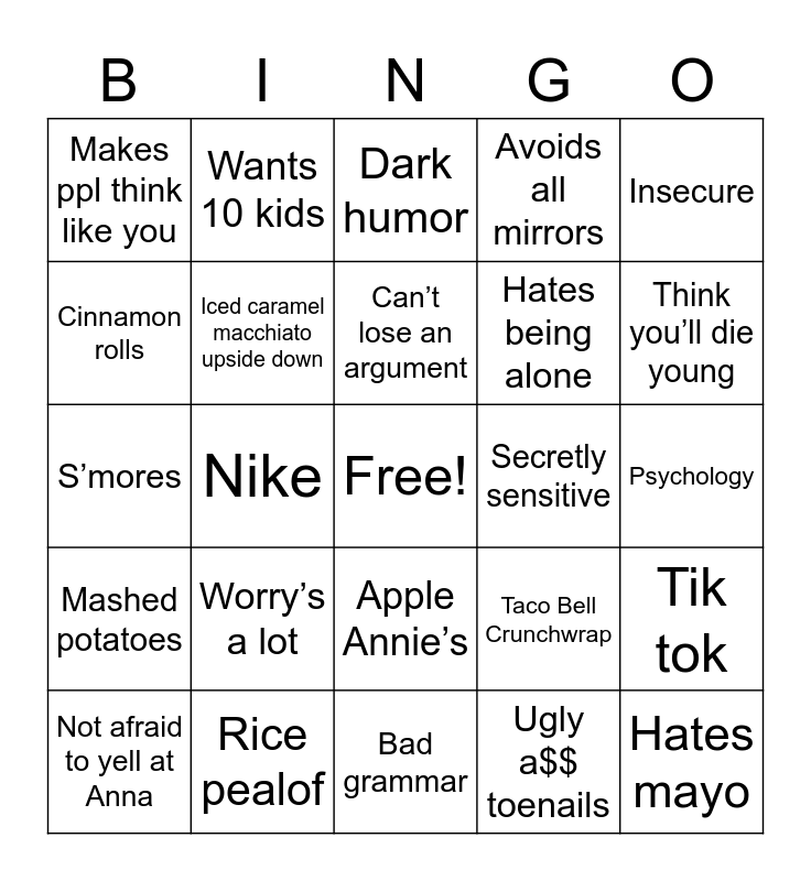 This bingo card has a free space and 24 words: Worry’s a lot, Rice pealof, Can’t lose an argument, Not afraid to yell at Anna, Insecure, Makes ppl think like you, Cinnamon rolls, Wants 10 kids, Secretly sensitive, Apple Annie’s, Hates being alone, S’mores, Taco Bell Crunchwrap, Tik tok, Iced caramel macchiato upside down, Ugly a$$ toenails, Psychology, Dark humor, Think you’ll die young, Nike, Hates mayo, Mashed potatoes, Avoids all mirrors and Bad grammar.
