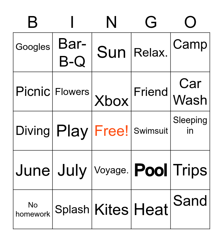 This bingo card has a free space and 29 words: Summer, Splash, Sun, Ice Cream, Camp, Googles, Flowers, Xbox, Swimsuit, Trips, No homework, Play, Heat, Sand, Diving, Grass, Kites, Pool, Car Wash, June, July, August, Friend, Sleeping in, Picnic, Bar-B-Q, Voyage., Relax. and Sun Screen.