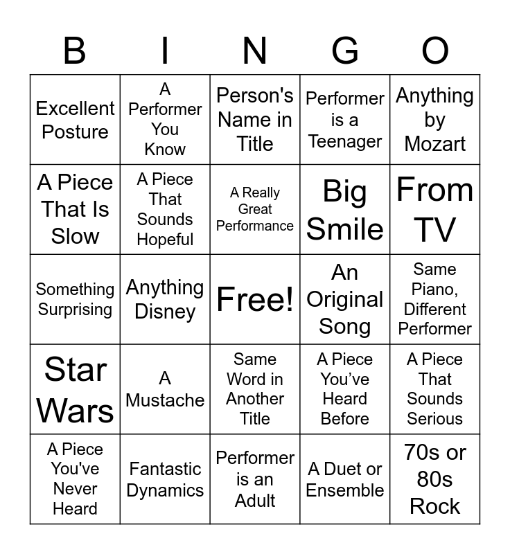 This bingo card has a free space and 53 words: "Boy" or "Girl" in Title, 70s or 80s Rock, A Bow or Curtsy, A Duet or Ensemble, A Mustache, A Performer You Don't Know, A Performer You Know, A Piece That Is Fast, A Piece That Is Slow, A Piece That Sounds Happy, A Piece That Sounds Hopeful, A Piece That Sounds Sad, A Piece That Sounds Serious, A Piece You’ve Heard Before, A Piece You'd Like to Learn, A Piece You've Never Heard, A Really Great Performance, An Original Song, Anything by Beethoven, Anything by Mozart, Anything Disney, Applause, Big Smile, Excellent Posture, Face Paint, Fantastic Dynamics, From a Movie, From a Musical, From a Video Game, From TV, Harry Potter, More Than One Performer, Multiple Angles in Video, Off-screen Accompaniment, One-Word Title, Performer in Costume, Performer is a Teenager, Performer is an Adult, Person's Name in Title, Really Long Title, Relaxed, Curved Hands, Same Performer, Different Piece, Same Piano, Different Performer, Same Show, Different Piece, Same Title, Different Performer, Same Word in Another Title, Something Adorable, Something Silly, Something Surprising, Star Wars, The Beatles, Video in Black & White and Virtual Background.
