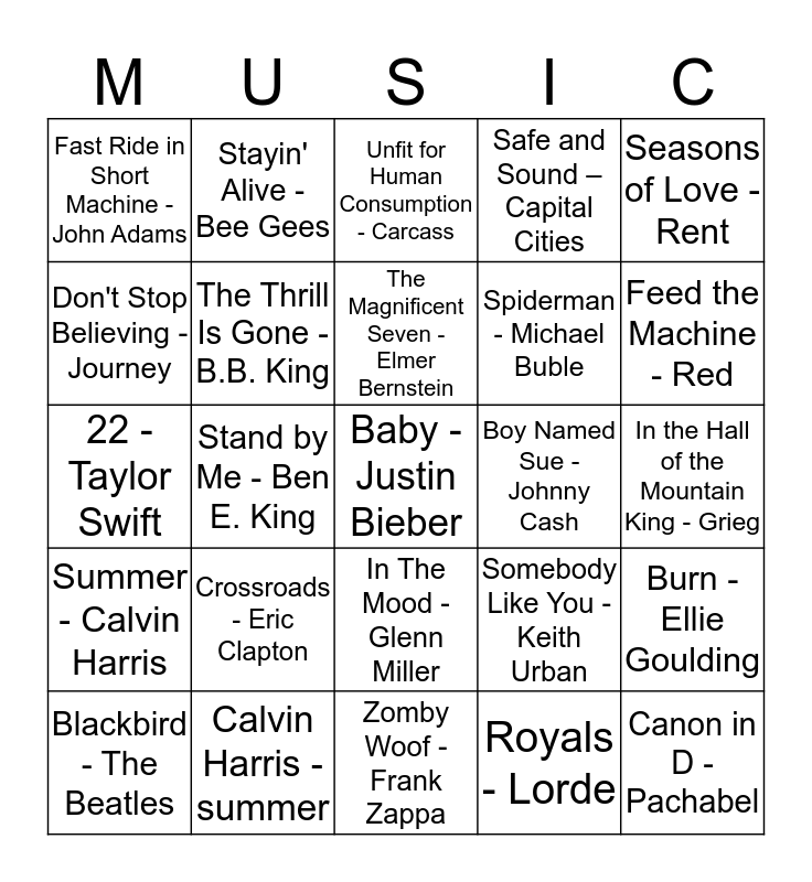 This bingo card has 25 words: Crossroads - Eric Clapton, Zomby Woof - Frank Zappa, The Magnificent Seven - Elmer Bernstein, Blackbird - The Beatles, Seasons of Love - Rent, Fast Ride in Short Machine - John Adams, Don't Stop Believing - Journey, Stayin' Alive - Bee Gees, Boy Named Sue - Johnny Cash, In The Mood - Glenn Miller, Spiderman - Michael Buble, 22 - Taylor Swift, Somebody Like You - Keith Urban, Burn - Ellie Goulding, The Thrill Is Gone - B.B. King, Canon in D - Pachabel, In the Hall of the Mountain King - Grieg, Unfit for Human Consumption - Carcass, Feed the Machine - Red, Stand by Me - Ben E. King, Baby - Justin Bieber, Calvin Harris - summer, Summer - Calvin Harris, Safe and Sound – Capital Cities and Royals - Lorde.