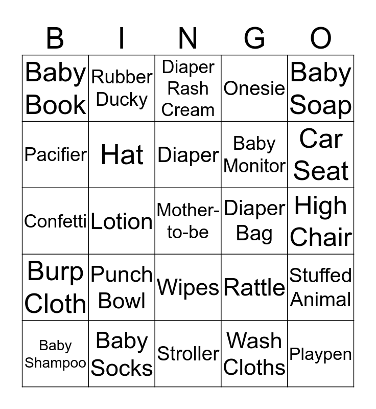 This bingo card has a free space and 48 words: Bottle, Playpen, Bib, Stroller, Punch Bowl, Balloons, Rubber Ducky, Toys, Pacifier, Camera, Hat, Onesie, Stuffed Animal, Rattle, Flowers, Booties, Diaper, Diaper Bag, Teething Toy, Baby Soap, Lotion, Wash Cloths, Baby Book, Baby Monitor, Blanket, Car Seat, Baby Shampoo, Swing, Wipes, Burp Cloth, Baby Towel, Bottle Washer, Formula, Baby Powder, Baby Socks, Baby Shirt, Doll, High Chair, Picture Frame, Photo Album, Night Light, Musical Toy, Diaper Rash Cream, Ice Cream, Confetti, Blocks, No-Scratch mittens and Baby Tub.