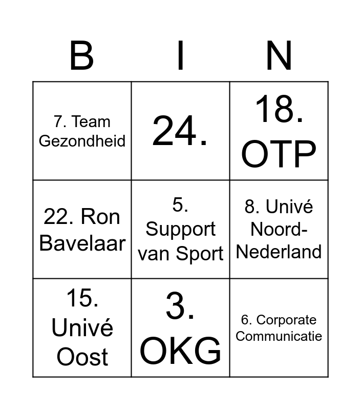 This bingo card has a free space and 24 words: 1. UKB, 2. Levenlang Univé, 3. OKG, 4. OKO, 6. Corporate Communicatie, 7. Team Gezondheid, 8. Univé Noord-Nederland, 24., Vrij!, 11. Univé Stad en Land, 10. Univé Dichtbij, 12. Univé Zuid-Nederland, 13. Univé Noord-Holland, 14. Univé het Groene Hart, 15. Univé Oost, 16. Samen, 17. Dichtbij, 18. OTP, 9. Univé Samen, 19. OTZ, 20. BOB, 21. Digitaal Denken en Doen, 22. Ron Bavelaar and 23. Ellen Peper.