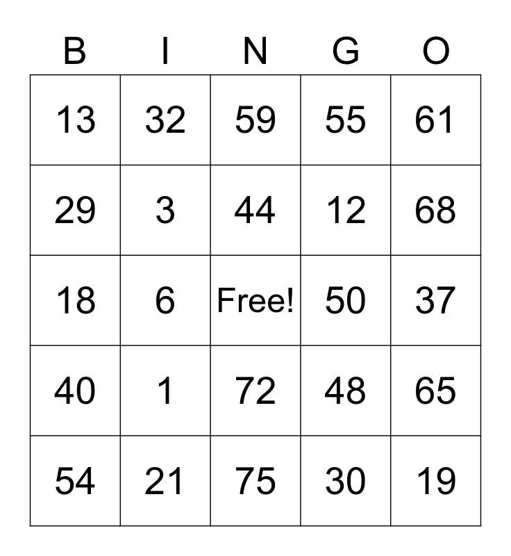 This bingo card has a free space and 24 words: 1, 21, 44, 54, 61, 13, 29, 32, 50, 72, 12, 18, 48, 65, 3, 30, 37, 59, 68, 6, 19, 40, 55 and 75.