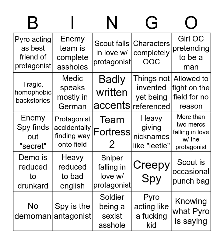 This bingo card has a free space and 24 words: Heavy reduced to bad english, Spy is the antagonist, Badly written accents, No demoman, Girl OC pretending to be a man, Pyro acting as best friend of protagonist, Tragic, homophobic backstories, Enemy team is complete assholes, Heavy giving nicknames like "leetle", Sniper falling in love w/ protagonist, Things not invented yet being referenced, Enemy Spy finds out "secret", Creepy Spy, Scout is occasional punch bag, Medic speaks mostly in German, Pyro acting like a fucking kid, More than two mercs falling in love w/ the protagonist, Scout falls in love w/ protagonist, Allowed to fight on the field for no reason, Protagonist accidentally finding way onto field, Knowing what Pyro is saying, Demo is reduced to drunkard, Characters completely OOC and Soldier being a sexist asshole.