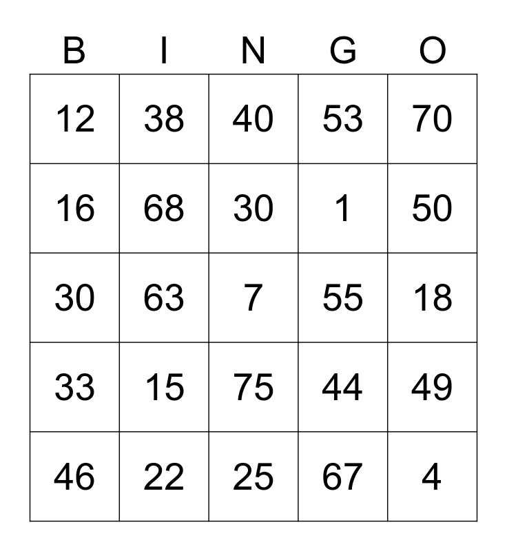 This bingo card has 25 words: 15, 25, 30, 46, 70, 12, 16, 38, 55, 75, 1, 30, 44, 49, 68, 4, 18, 40, 50, 63, 7, 22, 33, 53 and 67.