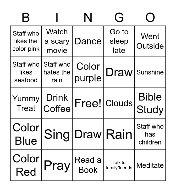 This bingo card has a free space and 29 words: Color Red, Go to sleep early, Drink Coffee, Listen to music, Staff who likes the color pink, Dance, Staff who hates the rain, Sing, Clouds, Pray, Bible Study, Meditate, Read a Book, Talk to family/friends, Sunshine, Watch a TV show, Draw, Color Blue, Went Outside, Yummy Treat, Rain, Walk, Draw, Staff who likes seafood, Go to sleep late, Watch a scary movie, Staff who has children, Color purple and Thunderstorm.