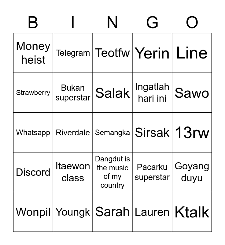 This bingo card has 25 words: Discord, Youngk, Semangka, Lauren, Line, Money heist, Telegram, Teotfw, Sirsak, Goyang duyu, Strawberry, Bukan superstar, Sarah, Pacarku superstar, Sawo, Wonpil, Riverdale, Salak, Ingatlah hari ini, 13rw, Whatsapp, Itaewon class, Dangdut is the music of my country, Yerin and Ktalk.