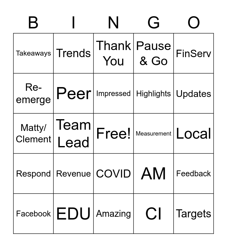 This bingo card has a free space and 29 words: Facebook, Optimal, Team Lead, Signals, Takeaways, Thank You, Peer, Revenue, Measurement, EDU, Local, Targets, Amazing, CI, Updates, QBR, COVID, Respond, FinServ, Matty/ Clement, AM, Demand Capture, Highlights, Re-emerge, Pause & Go, Trends, Feedback, Impressed and Community.