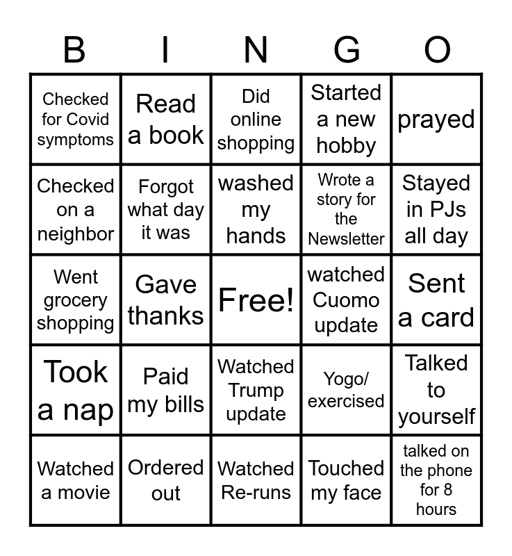 This bingo card has a free space and 34 words: Binged on TV, Touched my face, no toilet paper, Slept all day, Took a nap, Forgot what day it was, prayed, Watched a movie, Read a book, went for a walk, washed my hands, Did online shopping, Got some fresh air, Called a friend, watched Cuomo update, Stayed in PJs all day, Ordered out, Went grocery shopping, Paid my bills, Yogo/ exercised, Watched Trump update, Forgot your mask, Checked for Covid symptoms, Sent a card, Watched Re-runs, talked on the phone for 8 hours, Started a new hobby, Called Angelia, Wrote a story for the Newsletter, Checked on a neighbor, walked around the building, Gave thanks, Talked to yourself and Reflected.