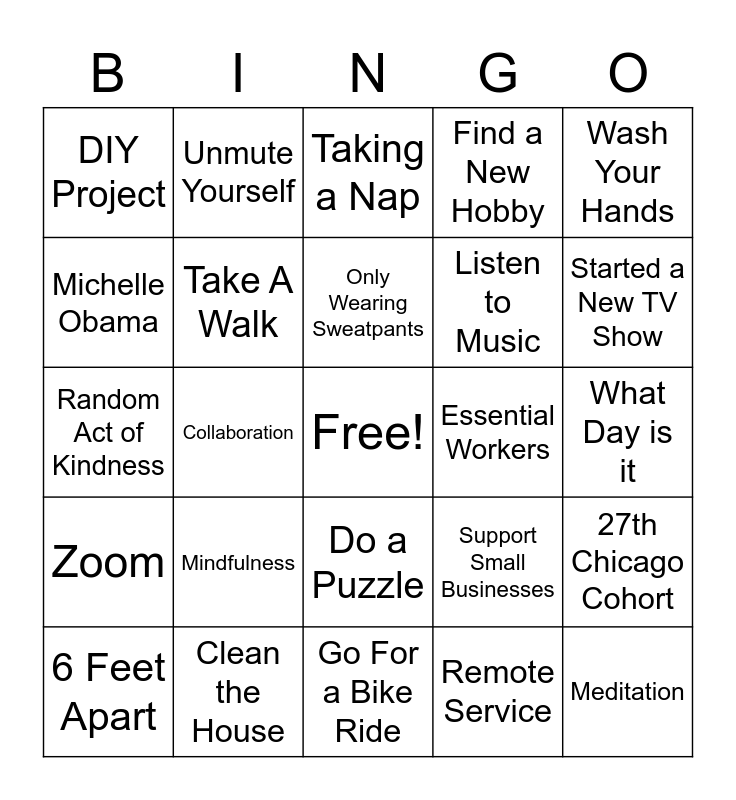 This bingo card has a free space and 34 words: Public Allies, Remote Service, Partner Night, Connect Virtually, Zoom, Take A Walk, Wash Your Hands, 6 Feet Apart, Unmute Yourself, Social Distance, Only Wearing Sweatpants, Taking a Nap, Rearranging Furniture, Catch up on Reading, Essential Workers, Started a New TV Show, Clean the House, Random Act of Kindness, Mindfulness, Support Small Businesses, Do a Puzzle, Living Room Workout, DIY Project, What Day is it, Go For a Bike Ride, Meditation, Find a New Hobby, Help a Neighbor, Listen to Music, Michelle Obama, 1993, Collaboration, 27th Chicago Cohort and AmeriCorps.