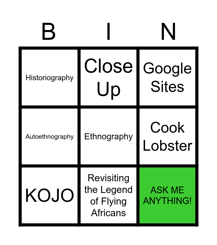 This bingo card has a free space and 8 words: Autoethnography, Close Up, Cook Lobster, KOJO, Google Sites, Historiography, Revisiting the Legend of Flying Africans and ASK ME ANYTHING!.
