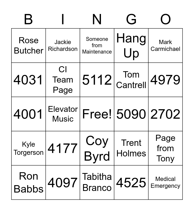This bingo card has a free space and 31 words: Tabitha Branco, Someone from IT, Elevator Music, Zach Spurling, Rose Butcher, Someone from Maintenance, CI Team Page, Trent Holmes, 5090, 4525, 2702, Medical Emergency, Repeat the Page, Hot Mic, 4979, 3479, Page from Tony, 4177, Kyle Torgerson, Coy Byrd, Mark Carmichael, Jonathan McNabb, Ron Babbs, Jackie Richardson, Tom Cantrell, 4031, Hang Up, 4001, 4097, 5112 and 4029.