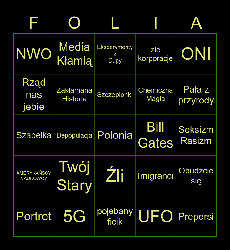This bingo card has a free space and 24 words: Twój Stary, 5G, Szczepionki, Portret, ONI, NWO, Rząd nas jebie, Media Kłamią, Bill Gates, Źli, Chemiczna Magia, Szabelka, Imigranci, Obudźcie się, Zakłamana Historia, UFO, Seksizm Rasizm, Eksperymenty z Dupy, Pała z przyrody, Depopulacja, Prepersi, AMERYKAŃSCY NAUKOWCY, złe korporacje and pojebany ficik.