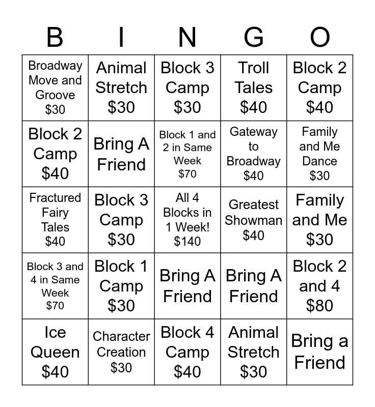 This bingo card has a free space and 24 words: Block 1 Camp $30, Character Creation $30, Block 1 and 2 in Same Week $70, Ice Queen $40, Block 2 Camp $40, Broadway Move and Groove $30, Block 2 Camp $40, Animal Stretch $30, Greatest Showman $40, Bring A Friend, Gateway to Broadway $40, Fractured Fairy Tales $40, Bring A Friend, Block 2 and 4 $80, Bring A Friend, Animal Stretch $30, Family and Me $30, Block 3 Camp $30, Family and Me Dance $30, Block 3 Camp $30, Bring a Friend, Block 3 and 4 in Same Week $70, Troll Tales $40 and Block 4 Camp $40.