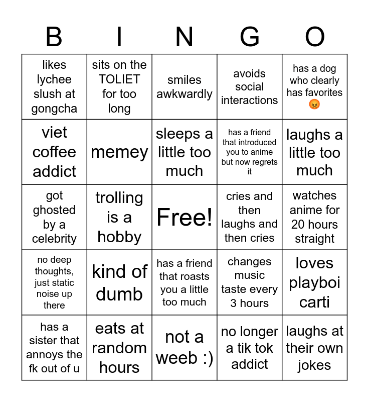 This bingo card has a free space and 24 words: kind of dumb, eats at random hours, sleeps a little too much, has a sister that annoys the fk out of u, has a dog who clearly has favorites 😡, likes lychee slush at gongcha, viet coffee addict, sits on the TOLIET for too long, cries and then laughs and then cries, has a friend that roasts you a little too much, has a friend that introduced you to anime but now regrets it, got ghosted by a celebrity, changes music taste every 3 hours, loves playboi carti, memey, no longer a tik tok addict, watches anime for 20 hours straight, smiles awkwardly, laughs a little too much, trolling is a hobby, laughs at their own jokes, no deep thoughts, just static noise up there, avoids social interactions and not a weeb :).