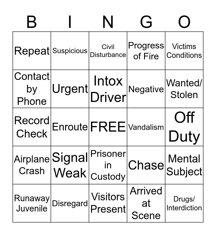 This bingo card has a free space and 24 words: Signal Weak, Disregard, Intox Driver, Runaway Juvenile, Victims Conditions, Repeat, Contact by Phone, Suspicious, Vandalism, Prisoner in Custody, Negative, Record Check, Chase, Mental Subject, Urgent, Arrived at Scene, Off Duty, Civil Disturbance, Wanted/ Stolen, Enroute, Drugs/ Interdiction, Airplane Crash, Progress of Fire and Visitors Present.