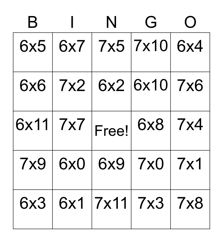 This bingo card has a free space and 24 words: 6x0, 6x1, 6x2, 6x3, 6x4, 6x5, 6x6, 6x7, 6x8, 6x9, 6x10, 6x11, 7x0, 7x1, 7x2, 7x3, 7x4, 7x5, 7x6, 7x7, 7x8, 7x9, 7x10 and 7x11.