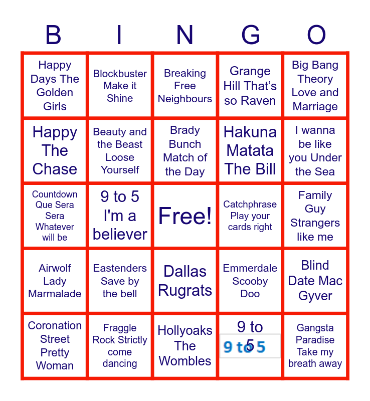 This bingo card has 2 images, a free space and 32 words: 9 to 5, 9 to 5, 9 to 5 I'm a believer, A Team Knight Rider, Airwolf Lady Marmalade, Beauty and the Beast Loose Yourself, Big Bang Theory Love and Marriage, Blind Date Mac Gyver, Blockbuster Make it Shine, Bob the Builder Maniac, Brady Bunch Match of the Day, Breaking Free Neighbours, Bullseye Only fools and Horses, Cant stop the feeling Pink Panther, Catchphrase Play your cards right, Cheers Postman Pat, Coronation Street Pretty Woman, Countdown Que Sera Sera Whatever will be, Dallas Rugrats, Eastenders Save by the bell, Emmerdale Scooby Doo, Fame Shallow, Family Guy Strangers like me, Fraggle Rock Strictly come dancing, Gangsta Paradise Take my breath away, Grange Hill That’s so Raven, Hakuna Matata The Bill, Happy The Chase, Happy Days The Golden Girls, Hollyoaks The Wombles, Home and Away Touch the Sky and I wanna be like you Under the Sea.