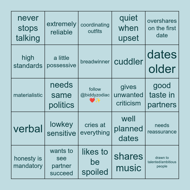 This bingo card has a free space and 24 words: lowkey sensitive, wants to see partner succeed, breadwinner, honesty is mandatory, overshares on the first date, never stops talking, high standards, extremely reliable, gives unwanted criticism, cries at everything, cuddler, materialistic, well planned dates, needs reassurance, a little possessive, shares music, good taste in partners, coordinating outfits, dates older, needs same politics, drawn to talented/ambitious people, verbal, quiet when upset and likes to be spoiled.