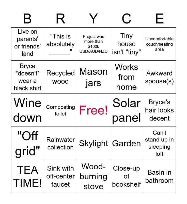 This bingo card has a free space and 29 words: TEA TIME!, DECK, Composting toilet, Lived in house < 6 months, Live on parents' or friends' land, Project was more than $100k USD/AUD/NZD, Recycled wood, Rainwater collection, Solar panel, Sink with off-center faucet, Bryce's hair looks decent, Basin in bathroom, Wood-burning stove, Close-up of bookshelf, Awkward spouse(s), DIY project and it shows, Skylight, "Off grid", Uncomfortable couch/seating area, Wine down, Garden, Child/pet in the house, Works from home, Bryce *doesn't* wear a black shirt, Tiny house isn't "tiny", "This is absolutely ______", Can't stand up in sleeping loft, Mason jars and Full size appliances.
