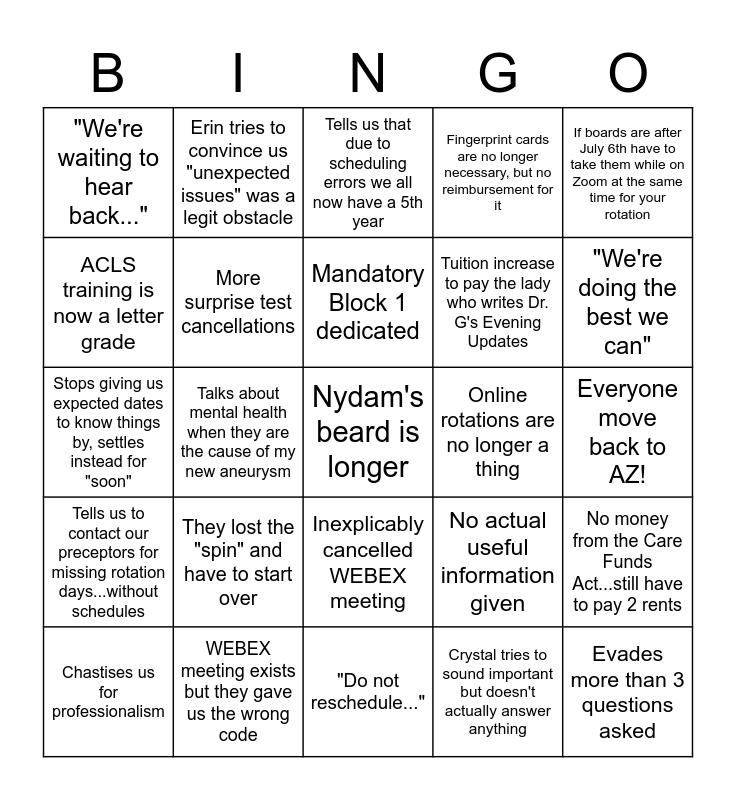 This bingo card has 25 words: They lost the "spin" and have to start over, "Do not reschedule...", Mandatory Block 1 dedicated, Chastises us for professionalism, If boards are after July 6th have to take them while on Zoom at the same time for your rotation, "We're waiting to hear back...", ACLS training is now a letter grade, Erin tries to convince us "unexpected issues" was a legit obstacle, Online rotations are no longer a thing, Inexplicably cancelled WEBEX meeting, Tuition increase to pay the lady who writes Dr. G's Evening Updates, Stops giving us expected dates to know things by, settles instead for "soon", No actual useful information given, No money from the Care Funds Act...still have to pay 2 rents, More surprise test cancellations, Evades more than 3 questions asked, Everyone move back to AZ!, Tells us that due to scheduling errors we all now have a 5th year, "We're doing the best we can", Talks about mental health when they are the cause of my new aneurysm, Nydam's beard is longer, WEBEX meeting exists but they gave us the wrong code, Tells us to contact our preceptors for missing rotation days...without schedules, Fingerprint cards are no longer necessary, but no reimbursement for it and Crystal tries to sound important but doesn't actually answer anything.