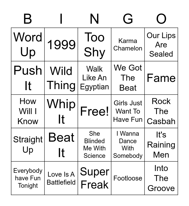 This bingo card has a free space and 52 words: Billie Jean, Into The Groove, Tainted Love, Super Freak, Beat It, Celebration, 1999, It Takes Two, Push It, Let The Music Play, Wild Thing, Pump Up The Jam, It's Raining Men, I Wanna Dance With Somebody, Love Shack, I Feel For You, Walk Like An Egyptian, Girls Just Want To Have Fun, The Safety Dance, Our Lips Are Sealed, Whip It, Footloose, Word Up, We Got The Beat, Walking On Sunshine, Funky Cold Medina, Sunglasses At Night, Relax, Fame, Conga, Friday I'm In Love, Karma Chamelon, Dance Hall Days, Talking In Your Sleep, One Thing Leads To Another, Too Shy, Love Is A Battlefield, Rock Me Amadeus, Hip To Be Square, Rebel Yell, Talk Dirty To Me, Rock The Casbah, Straight Up, Walk The Dinosaur, She Blinded Me With Science, Simply Irresistible, Wake Me Up Before You Go Go, How Will I Know, Nasty, Step By Step, Everybody have Fun Tonight and Cruel Summer.