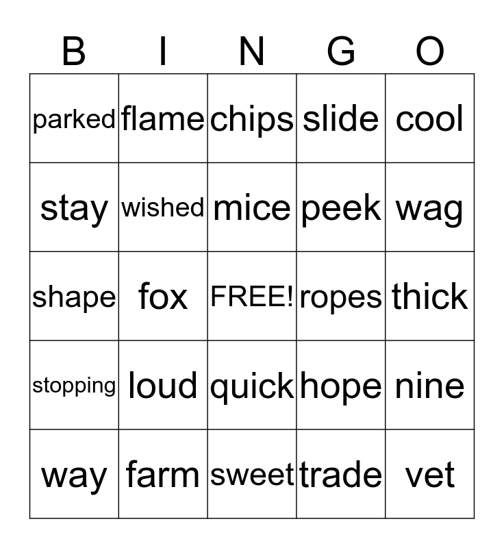 This bingo card has a free space and 24 words: loud, farm, mice, way, cool, parked, stay, flame, ropes, quick, peek, shape, hope, nine, wished, trade, thick, chips, wag, fox, vet, stopping, slide and sweet.