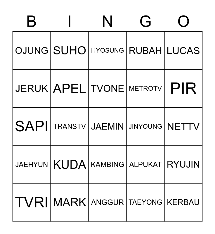 This bingo card has 25 words: JAEHYUN, MARK, JAEMIN, TAEYONG, LUCAS, OJUNG, SUHO, HYOSUNG, JINYOUNG, RYUJIN, JERUK, APEL, ANGGUR, ALPUKAT, PIR, TVRI, TRANSTV, TVONE, METROTV, NETTV, SAPI, KUDA, KAMBING, RUBAH and KERBAU.