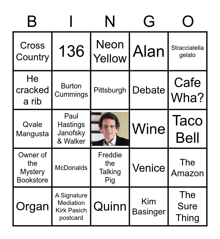 This bingo card has a free space and 47 words: La Jolla, The Sure Thing, Gerry Beckley, Quinn, McDonalds, 3, 136, Ink, He cracked a rib, USC, Burton Cummings, Alan, The Amazon, Venice, All of the above, Seattle, Pittsburgh, Wine, Beverly Hills Hotel, Stracciatella gelato, Paul Hastings Janofsky & Walker, Kim Basinger, Cross Country, Debate, Kathy Hardie, Cafe Wha?, Organ, Shannon Dougherty, Freddie the Talking Pig, Owner of the Mystery Bookstore, Metrognome, Reindeer Romp, Class Wit, Peas, Chocolate, A Signature Mediation Kirk Pasich postcard, Taco Bell, Denzel Washington, Disneyland, Tequila, The Enterprise, Neon Yellow, Qvale Mangusta, 12, Thanksgiving, March and 33 1/3.