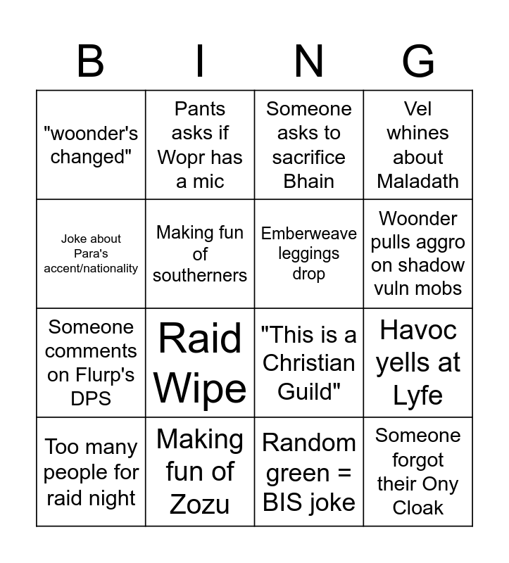 This bingo card has 16 words: Making fun of Zozu, Havoc yells at Lyfe, Someone asks to sacrifice Bhain, "woonder's changed", Someone comments on Flurp's DPS, Pants asks if Wopr has a mic, "This is a Christian Guild", Random green = BIS joke, Joke about Para's accent/nationality, Making fun of southerners, Too many people for raid night, Vel whines about Maladath, Raid Wipe, Woonder pulls aggro on shadow vuln mobs, Emberweave leggings drop and Someone forgot their Ony Cloak.