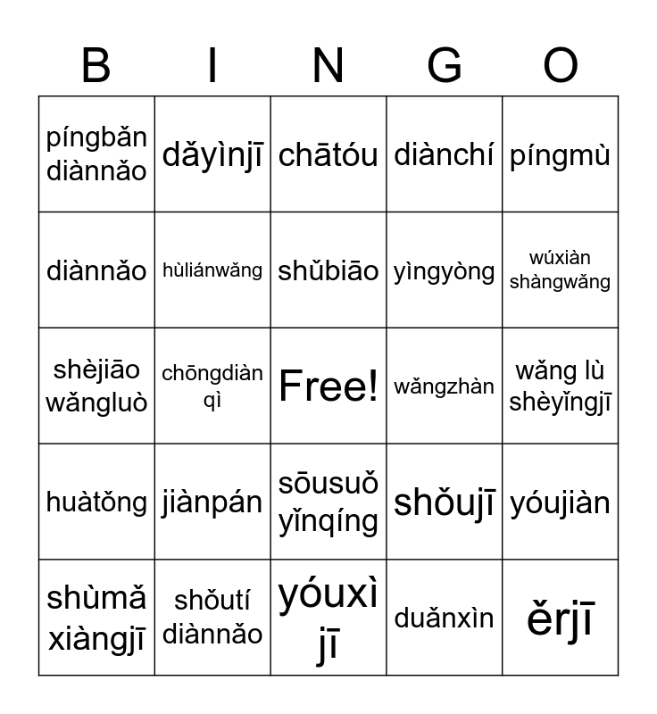 This bingo card has a free space and 24 words: jiànpán, shǒutí diànnǎo, shǔbiāo, shùmǎ xiàngjī, píngmù, píngbǎn diànnǎo, diànnǎo, dǎyìnjī, wǎngzhàn, sōusuǒ yǐnqíng, yìngyòng, shèjiāo wǎngluò, shǒujī, yóujiàn, hùliánwǎng, duǎnxìn, wǎng lù shèyǐngjī, chātóu, wúxiàn shàngwǎng, chōngdiàn qì, ěrjī, huàtǒng, diànchí and yóuxì jī.
