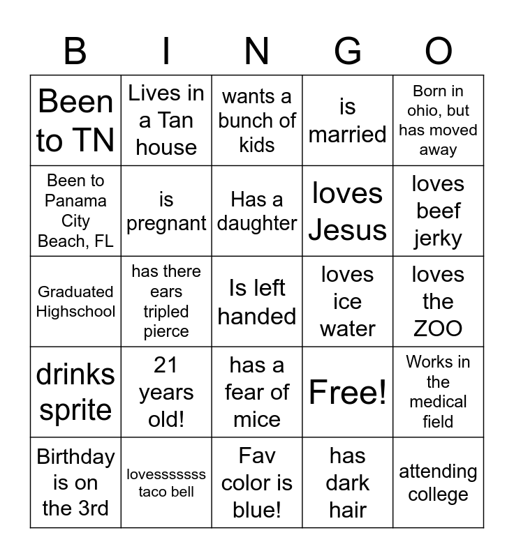This bingo card has 25 words: 21 years old!, Fav color is blue!, Has a daughter, Birthday is on the 3rd, Born in ohio, but has moved away, Been to TN, Been to Panama City Beach, FL, Lives in a Tan house, loves ice water, has a fear of mice, loves Jesus, Graduated Highschool, Free!, Works in the medical field, is pregnant, attending college, loves the ZOO, wants a bunch of kids, loves beef jerky, has there ears tripled pierce, Is left handed, lovesssssss taco bell, drinks sprite, is married and has dark hair.
